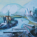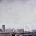 Naar aanleiding van Vaartweg 2 heeft het Rotterdams bedrijfsleven Hans uitgenodigd om, met een knipoog, zijn visie weer te geven op de stad Rotterdam over 650 jaar. olieverf op paneel 1990...