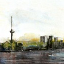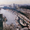 Woonhuizen aan de noordzijde van de Wijnhaven ten oosten van de spoorbrug. Rechts het Witte Huis. In het midden een pyloon van de vroegere draaispoorbrug. Aquarel 1985 Gemeente Archief Rotterdam...