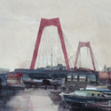 Binnenschepen en dwarshelling in de oude haven met op de achtergrond de Willemsbrug en het…